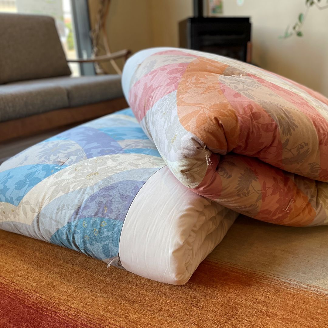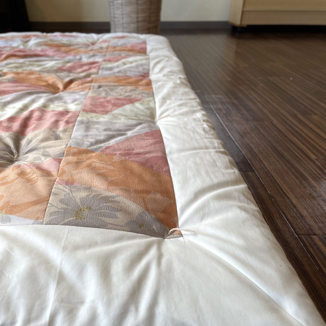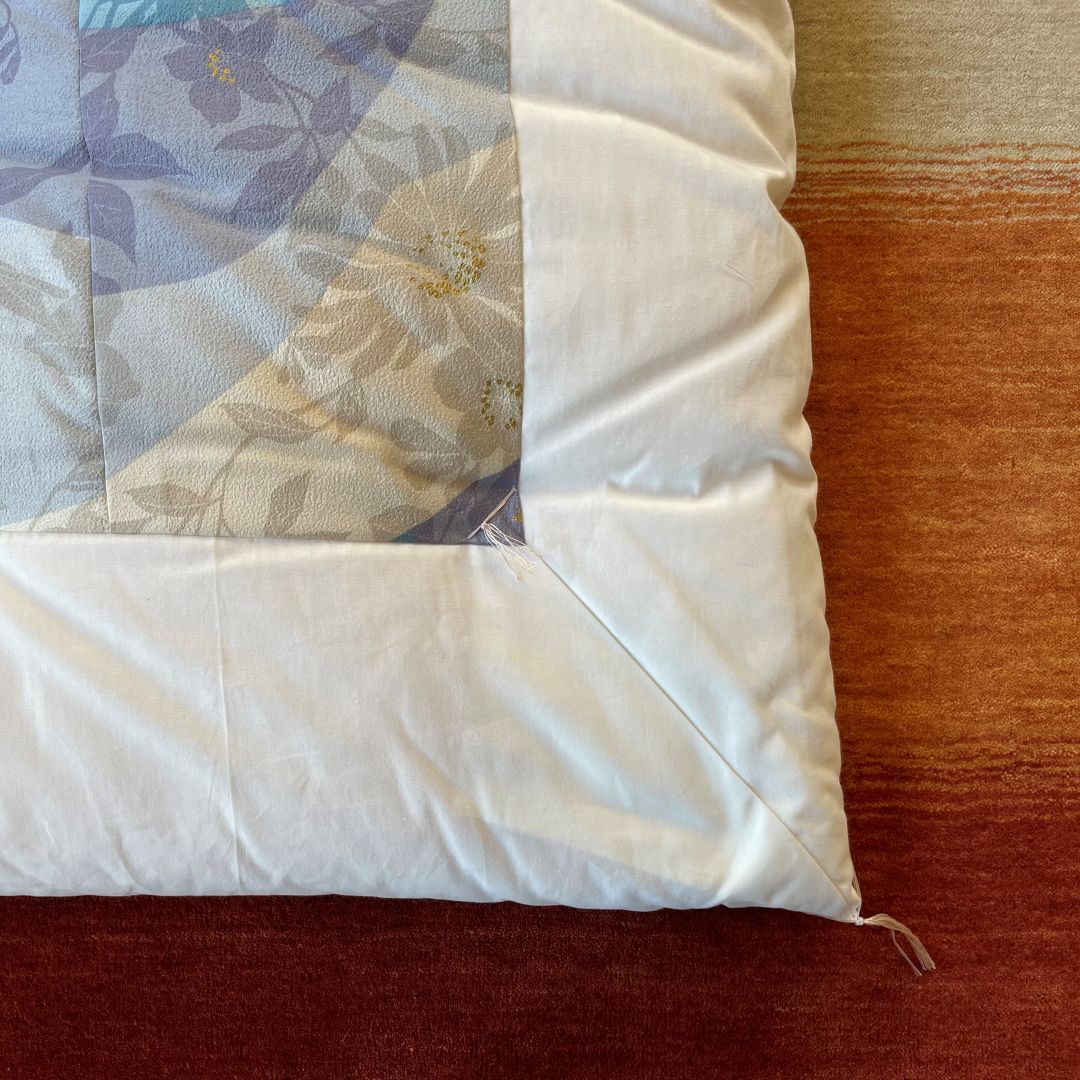 ご注文サイズに合わせてお仕立てしておりますが、綿を入れた後の新品完成サイズはボリュームがあるため、幅・丈ともに5〜10cm前後短くなる場合がございます。 |